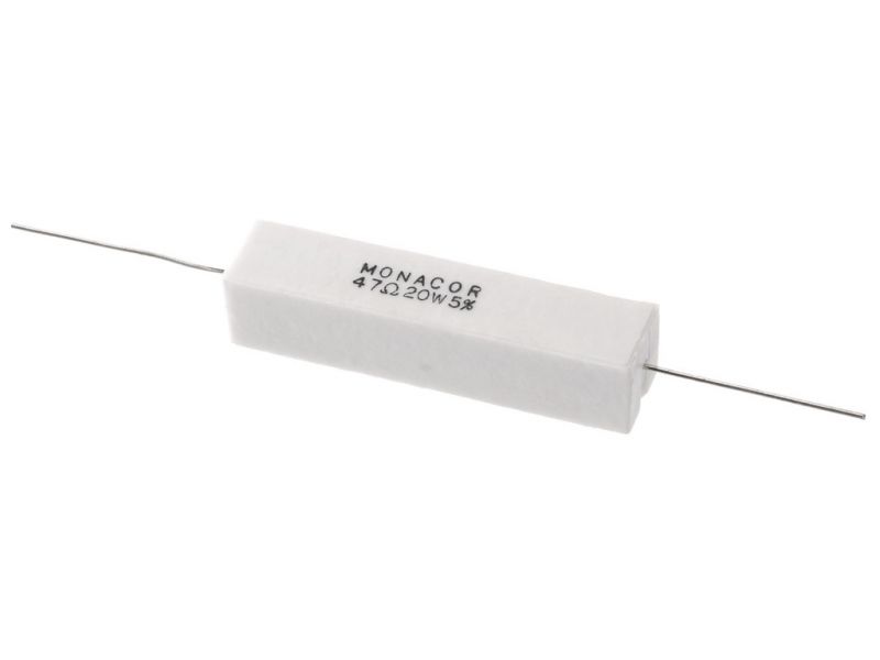 Výkonný cementový odpor, 47 Ω, 20 W Odpor pre použitie vo výhybkách, predovšetkým pre PA a špičkové aplikácie, tiež sa pripájajú ako záťažové odpory.