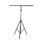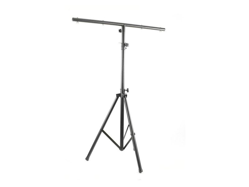 BoomToneDJ LT1 Metal Light stand Stand with mounting bar for 1 to 8 fixtures T#Bar Max load 30 kg Diameter of Tube 38mm Black paint finish 4 screws for attachment points Safety Pin grooved Body 2 feet tubes Feet foldable tripod B...