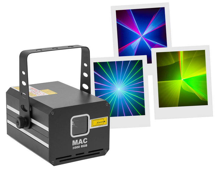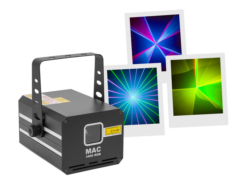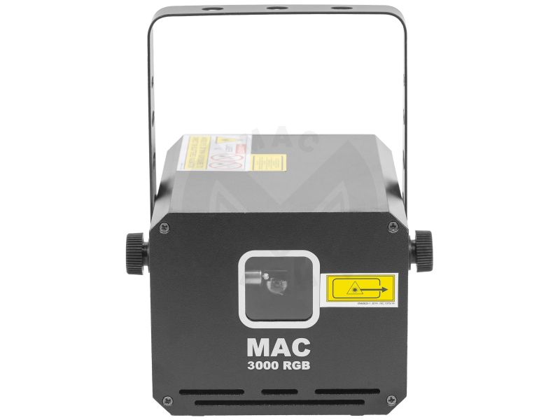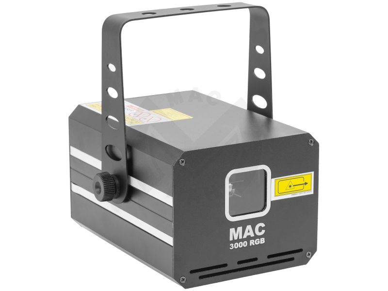 3,000 mW RGB colour animation LASER, automatic, DMX and musical modes.Mac Mah MAC 3000 RGBClass 4Protection keyAluminium housingILDA input and output interface3 mm diameter LASER beamScan Fail Safety'' system automatically switches off the LASER...