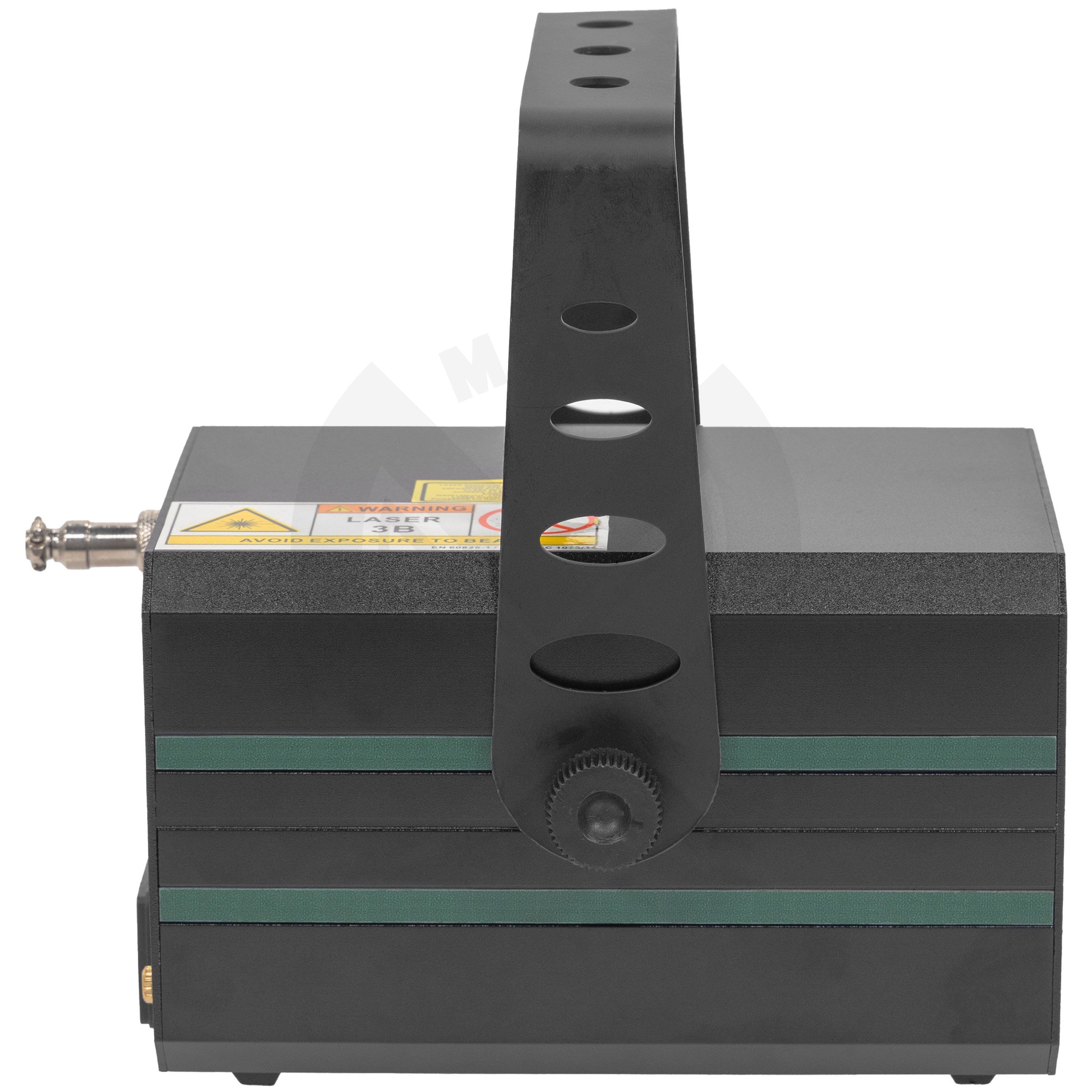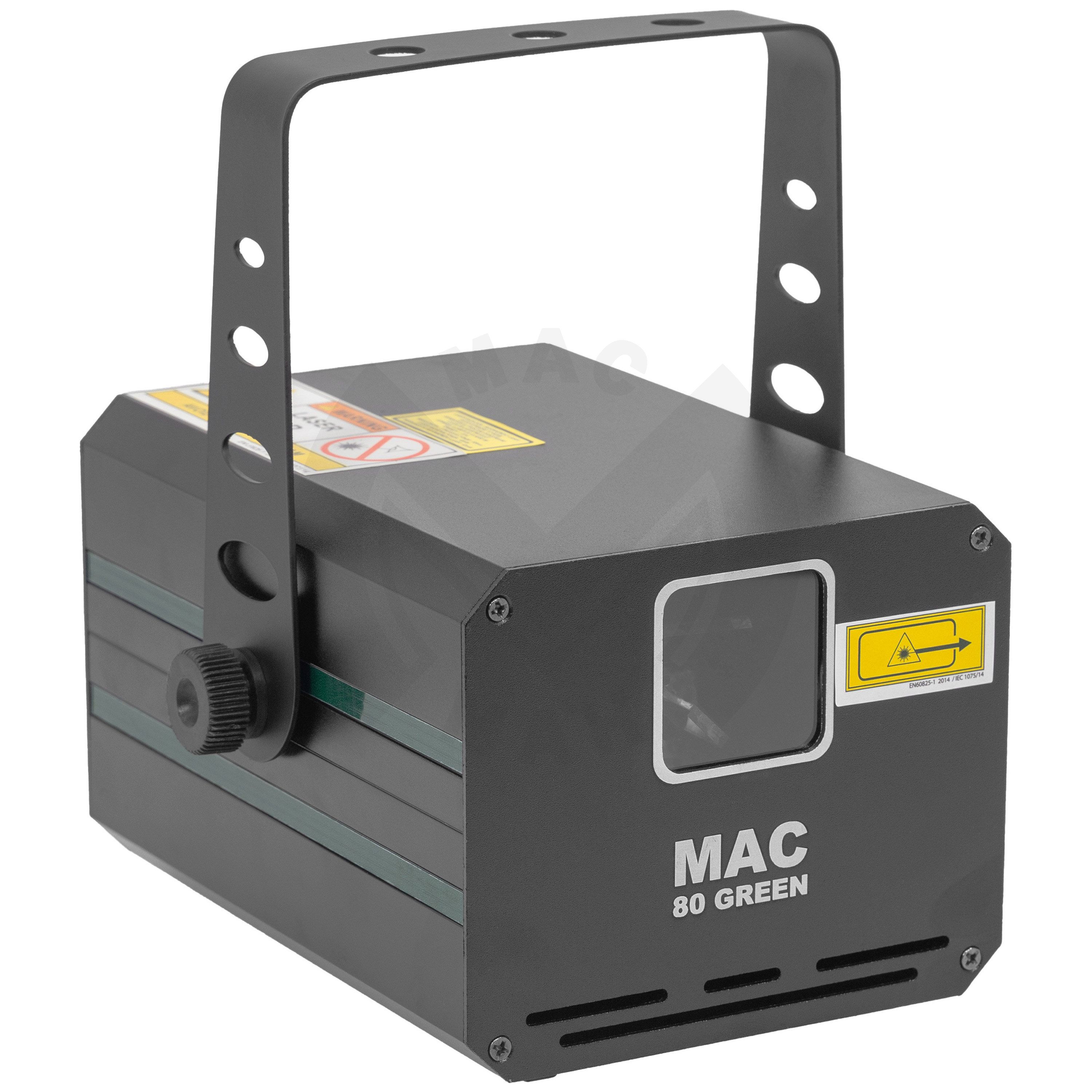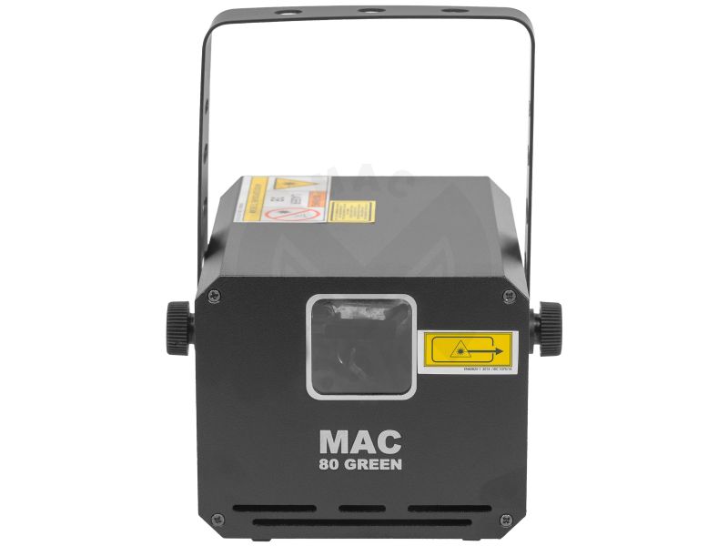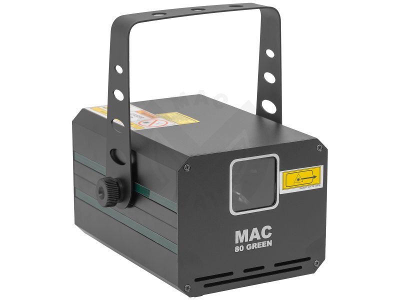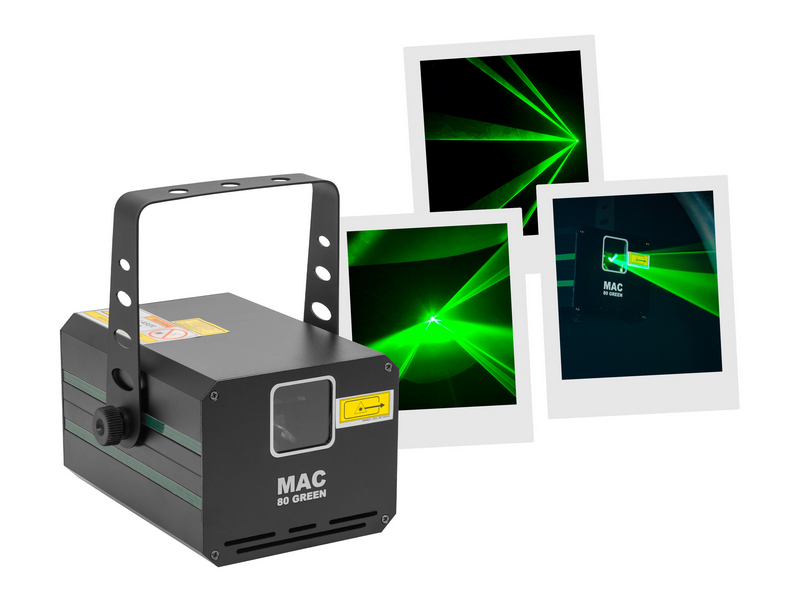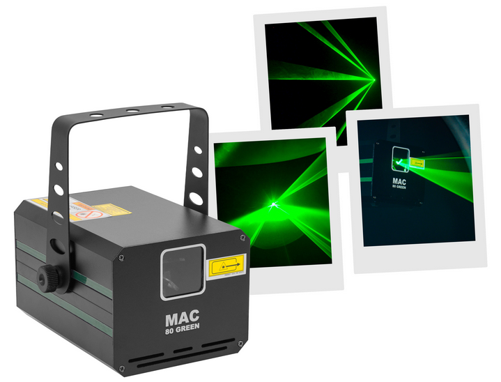 Green animation LASER, 80 mW power, automatic, DMX and musical modes. Class 3B Protection key Aluminium housing 3 mm diameter LASER beam Scan Fail Safety'' system automatically switches off the LASER in the event of a fault in the mirror mot...