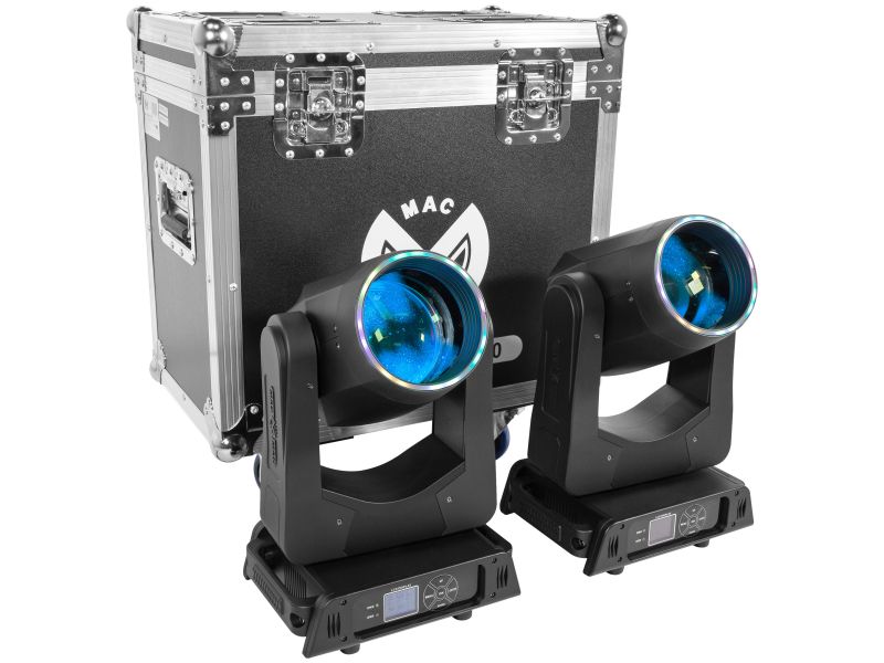 Mac Mah Mac Beam 200 Set - 2 x 200 W white LED speakers with gobos, rotating prism and 2.5° beam. Supplied in a sturdy flight case for secure transport.
