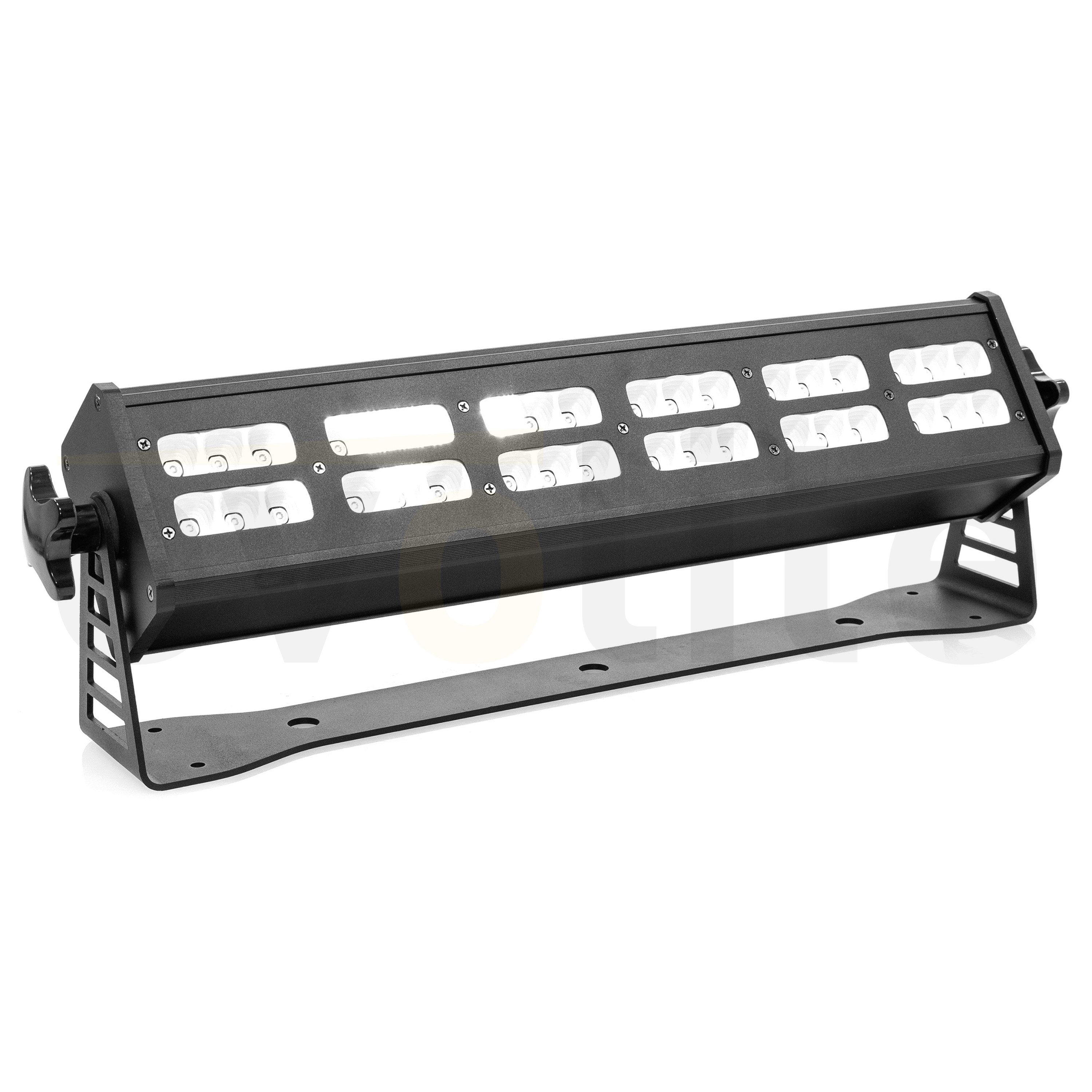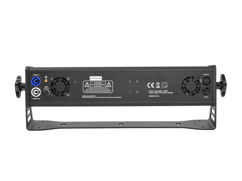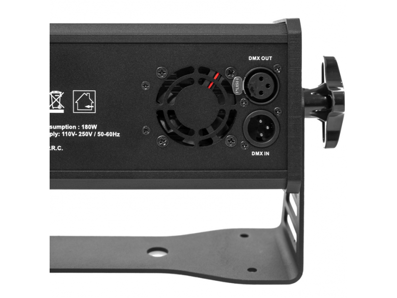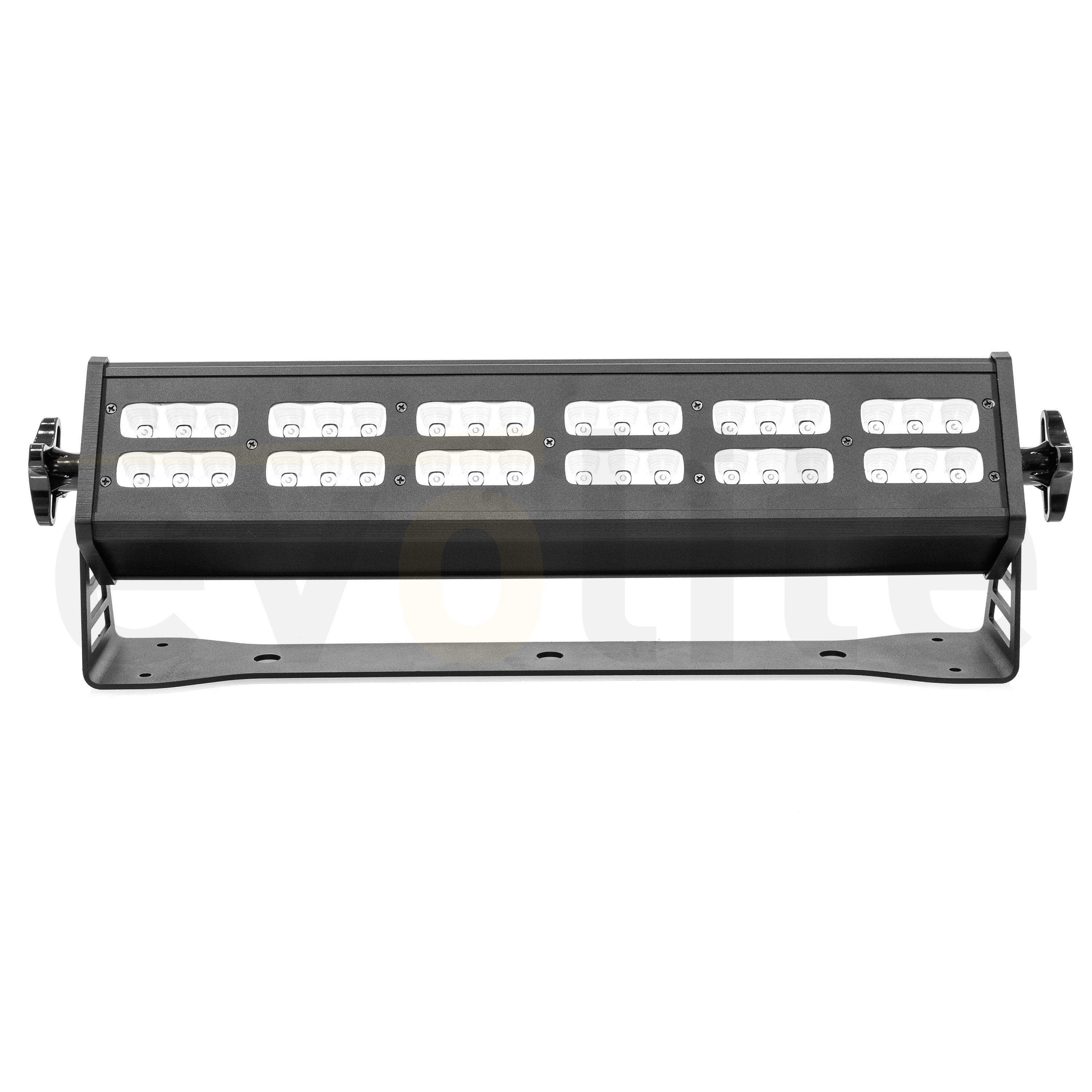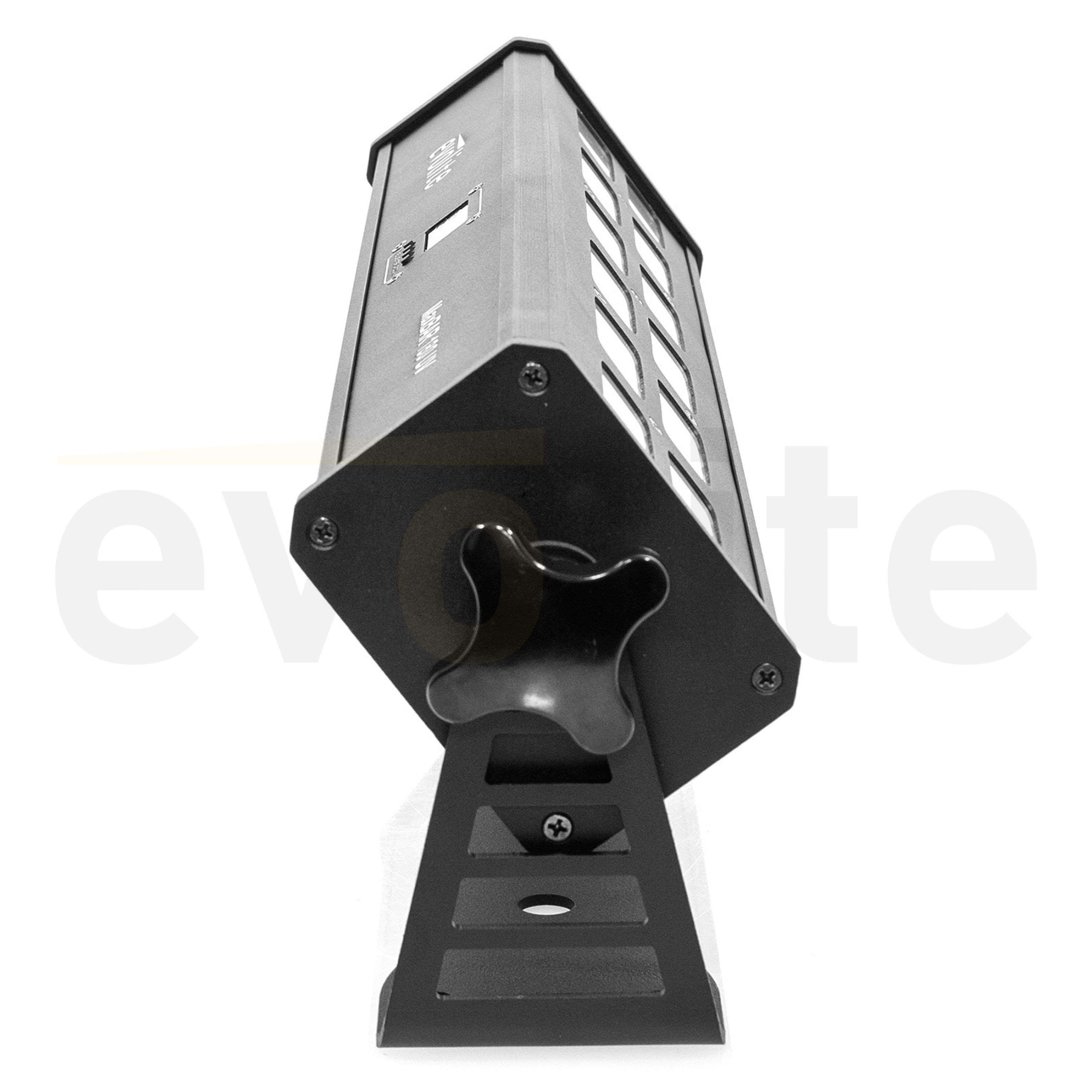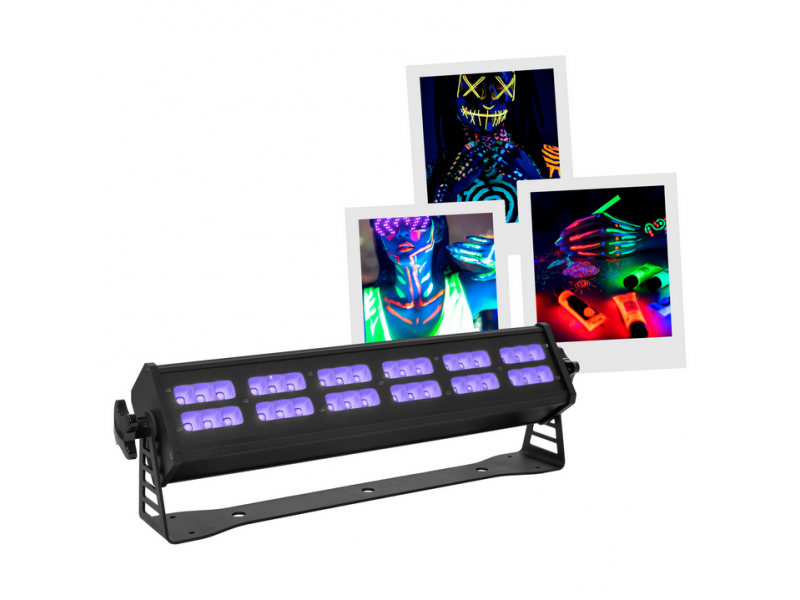 LED bar for interior lighting, evolite MaxBar 180 UV.evolite MaxBar 180 UVLED bar for interior lightingIdeal direct projectionControllable by DMX512Strobe effect with variable speedDimmer (0#100%)Control panel with displayReset option with factory presets...