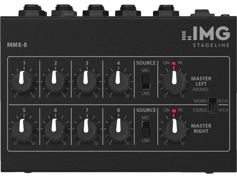 Miniatúrny univerzálny audio mix 8 mono kanálov, prepínateľné mic/line Výber zo 4 stereo kanálov 2 ovládače výstupnej úrovne, 2 peak LED Dodávané bez batérie