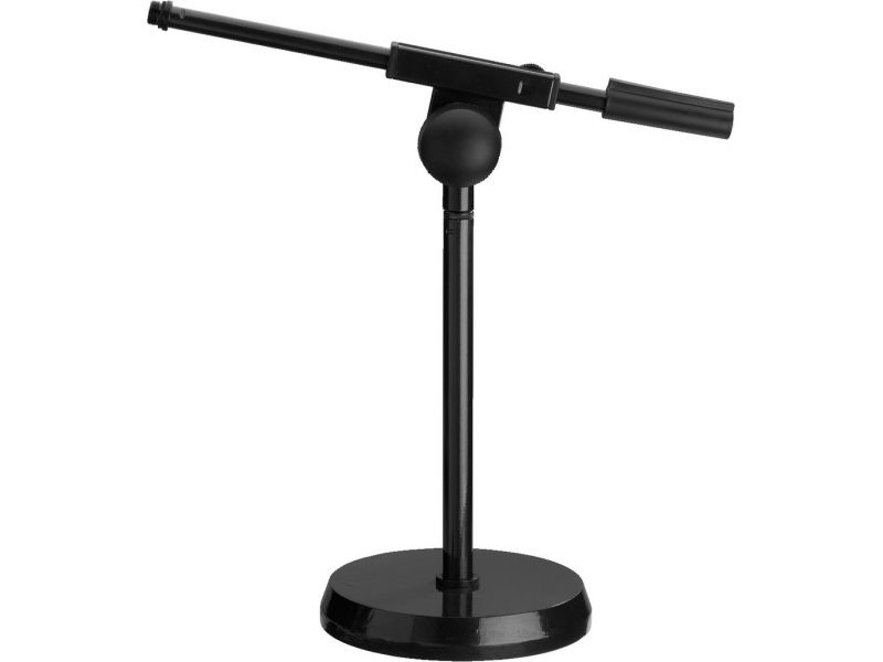 Stolový mikrofónny stojan/podlahový stojan Čierny lakovanýTlmiaci nárazyVýsuvné rameno (dĺžka ramena: 375 mm)Nastaviteľná výška: 365-550 mmZávit: 16 mm (⅝") a 9 mm (⅜")Hmotnosť: 2.5 kg
