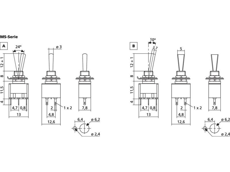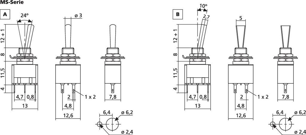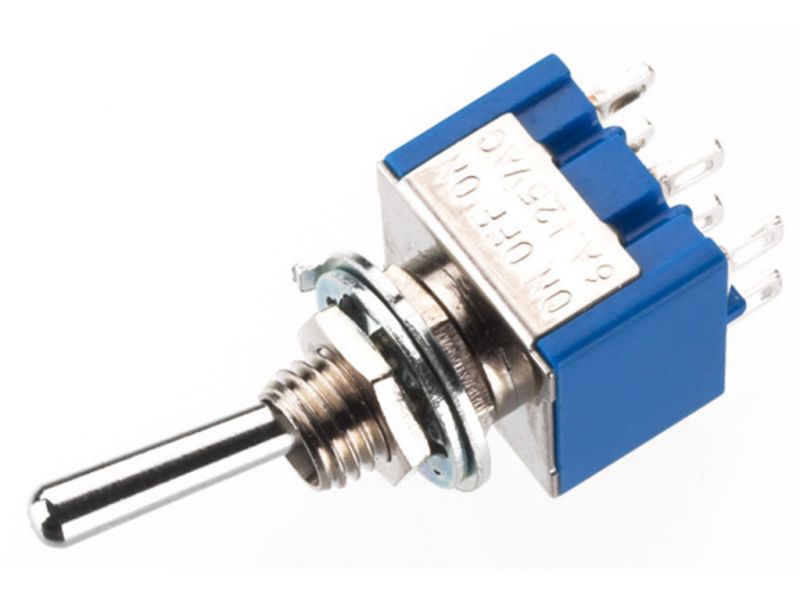 Páčkový prepínač Prepínanie: 2 x ON/OFF/ON Pre vysoké spínacie prúdy a dlhú životnosť Centrálne fixovanie: Ø 6 mm Pre bezpečné nízke napätie alebo signálne napätie Nízky kontaktný odpor 20 mΩ max. Utesnené spájkovacie kontakty Pochrómovaný prepínač