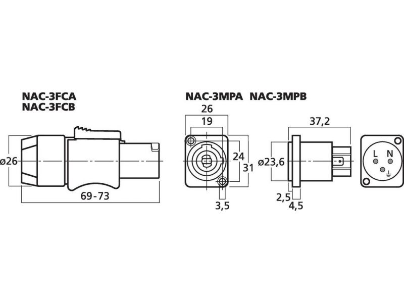 NEUTRIK POWERCON konektor Pre sieťové zapojenie do ~ 250 V/20 A Verzia pre sieťové zapojeniePrípojky pre uzemňovací, fázový a nulový vodič Robustná verzia so západkovým zariadením, všetky izolované kontakty a káblový vstup so samočinne nastaviteľnými sv...