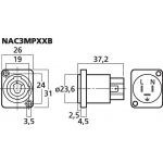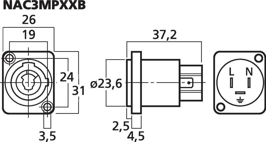 NEUTRIK POWERCON panel jack For mains connection up to ˜ 250 V/20 A Version for mains output Connections for ground, phase and neutral connector Self-extinguishing according to UL-94 V-0 Manufacturer information: Neutrik AGIm alten Ried 1439494...