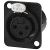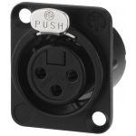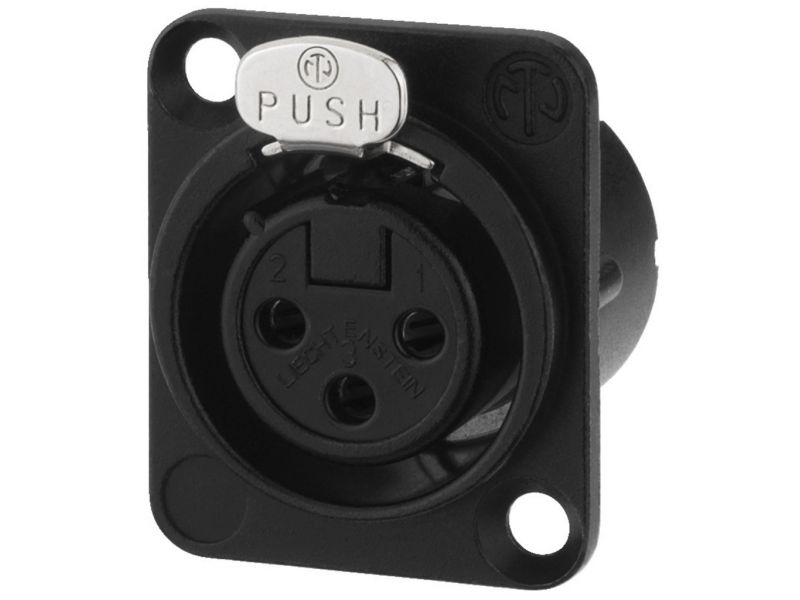 NEUTRIK XLR panelová samica, 3 pólová Strieborná úprava kontaktov Celokovové telo, pochrómované čierne Dvojitý kontakt uzemnenia D série