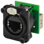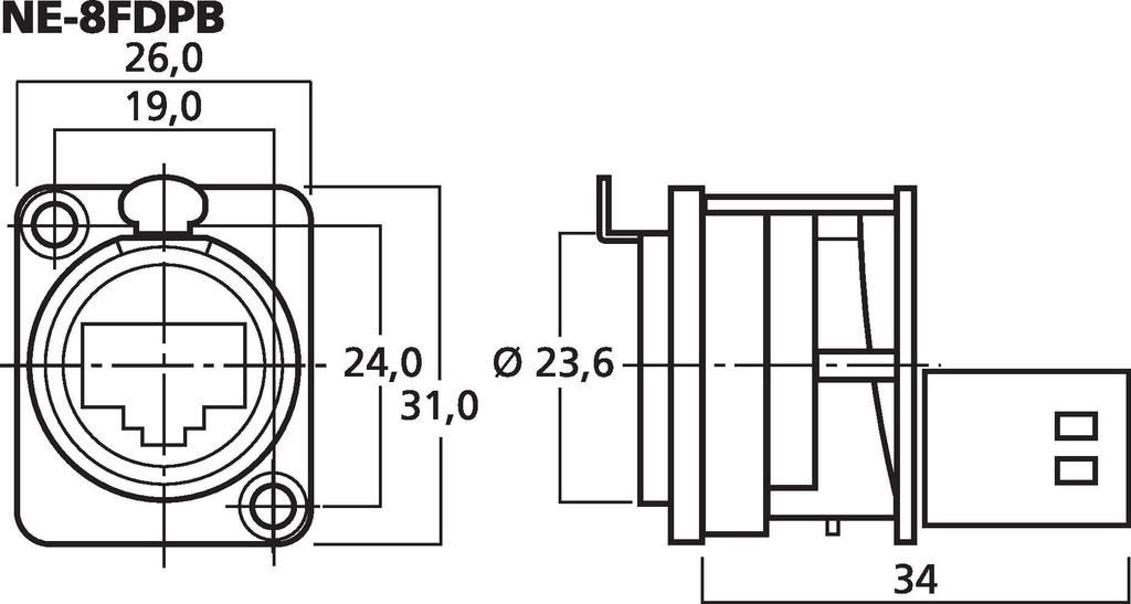 EtherCon panelové prechodky, pre priemyselné použitie a ethernetovú kabeláž na pódiu. RJ45 samica s odľahčením ťahu RJ45 samica v patch verzií D série Zodpovedá požiadavkám Cat. 5 podľa TIA/EIA a ISO/IEC NE-8FDP = poniklované NE-8FDPB = čierne