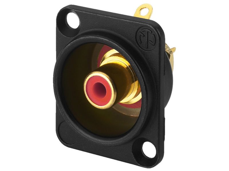 RCA panelová samica, v tele panelového konektora XLR série D. Čierne kovové telo Pozlátené kontakty Červené kódovanie