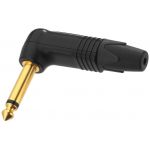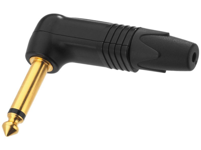NEUTRIK 6.3 mm mono konektor, pravouhlý Pozlátené kontakty Celokovové telo, čierne Tenké, nekĺzavé telo Odľahčenie ťahu a ochrana proti ohybu kábla Pre káble až do: Ø 4-7 mm