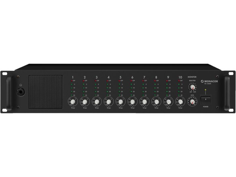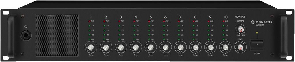 Monitorovacia jednotka, 10 + 1 kanálov Audio zdroje sa vyberajú pomocou otočného prepínača 10 monitorové vstupy 1-100 V/10 kΩ 1 aux vstup 0 dB (0.775 V)/600 Ω Úroveň ovládania, LED VU meter a clip LED pre každý vstup monitoru Zabudovaný 2 W reproduktor,...
