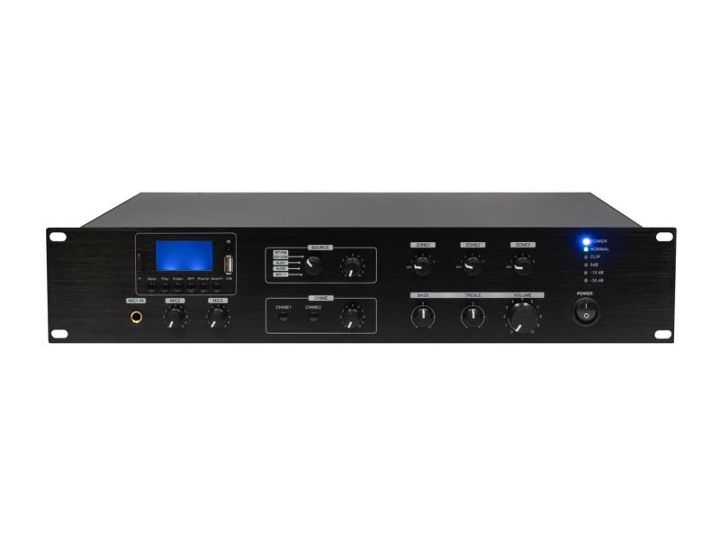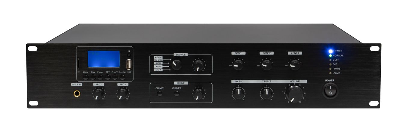 PA zmiešavací zosilňovač je navrhnutý pre malé 3-zónové komerčné audio riešenia, každý zónový reproduktor môže byť nastavený na inú výstupnú hlasitosť. 19” rackový mixážny zosilňovač so zabudovaným prehrávačom audio zdrojov integruje radič zónovéh...