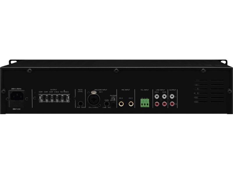 Mono PA mixážny zosilňovač 1 x 120 WRMS Tichá prevádzka vďaka chladeniu bez ventilátora 3 mikrofónne vstupy (z toho 1 je symetrický) Mic 1 s prioritou a nastaviteľnou automatickou funkciou talkover 2 aux vstupy 1 tel. vstup pre tel. systémy s audio výs...