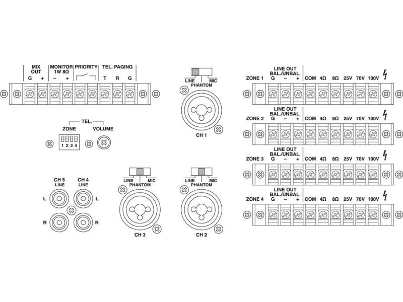 | Connections | 3 x combo 6.3 mm/XLR (mic/line), 2 x RCA L/R (line), screw terminal (mix out), screw contacts (paging), screw contacts (priority), 3.5 mm stereo jack (headphones), screw contacts (speaker zone), screw contacts (monitor speakers) |