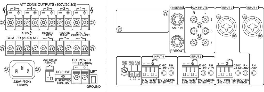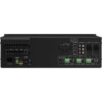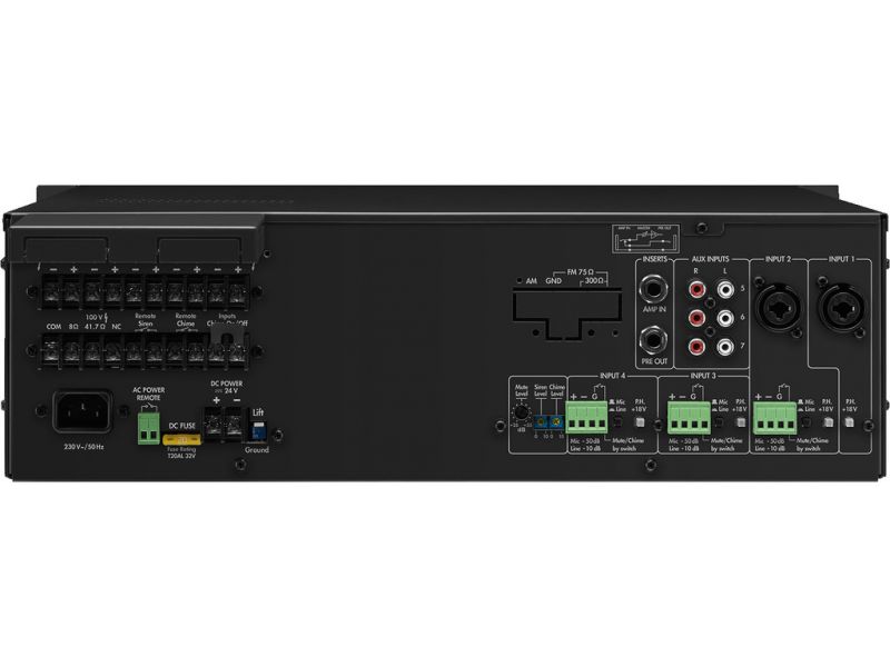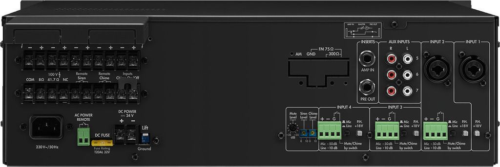 | Connections | 2 x 6.3 mm jack (mic), 1 x combo 6.3 mm/XLR (mic/line), 3 x RCA L/R (line), 3 x plug-in terminals (line), 1 x 6.3 mm jack (preamplifier input), screw contacts (push-to-talk mic), screw contacts (zone paging mic), 1 x 6.3 mm jack (preamplifier output), screw contacts (chime button), screw contacts (speakers) |