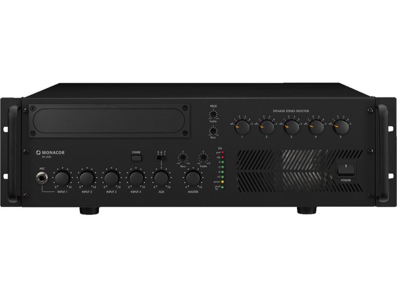 5-zónový mono PA mixážny zosilňovač 1 x 240 W 5 zón, ktoré je možné ovládať samostatne Gong, nepretržitý zvuk, siréna, automatické stlmenie, gong a sirénu je možné aktivovať externým tlačidlom, 2-tónový gong alebo 4-tónový gong (voliteľné) Ovládanie ba...