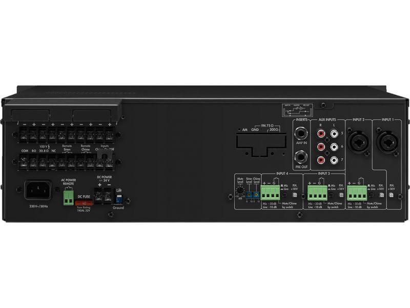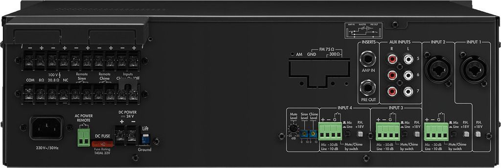 | Connections | 1 x 6.3 mm jack (mic), 2 x combo 6.3 mm/XLR (mic/line), 3 x RCA L/R (line), 3 x plug-in terminals (line), 1 x 6.3 mm jack (preamplifier input), screw contacts (push-to-talk mic), screw contacts (zone paging mic), 1 x 6.3 mm jack (preamplifier output), screw contacts (chime button), screw contacts (speakers) |