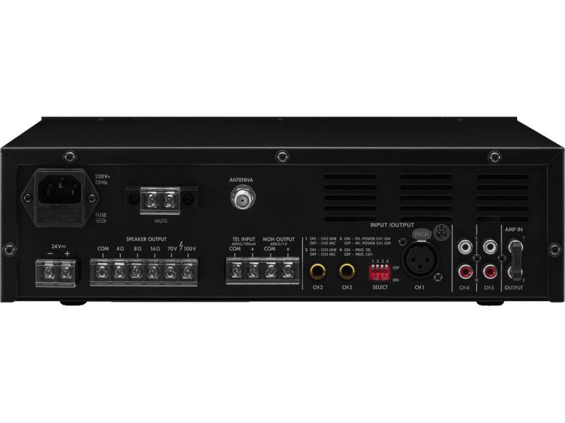 | Connections | 1 x XLR (channel 1), 2 x 6.3 mm jack (channels 2-3) 2 x RCA L/R (channels 4-5), 1 x RCA (amp in), 1 x RCA (preamp out), 1 x F jack (FM/DAB+), screw contacts (tel. input), screw contacts (MOH), screw contacts ( DC 24 V), screw contacts (mute), screw contacts (speakers) |