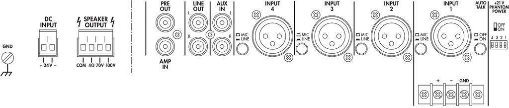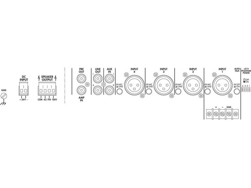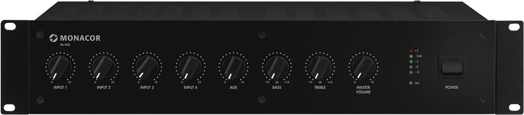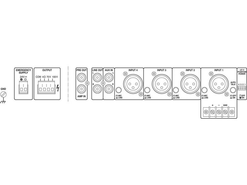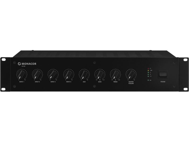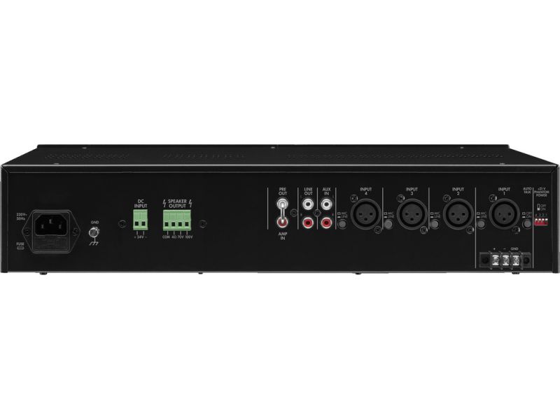 Mono PA mixážny zosilňovač 1 x 120 W Tichá prevádzka vďaka koncepcií chladenia bez ventilátora 4 symetrické mic/line vstupy Mic 1 s prioritným okruhom a automatickým talkover Ďalšie pripojenie cez stolný mikrofón a skrutkovací terminál 1 aux vstup Repr...