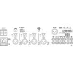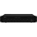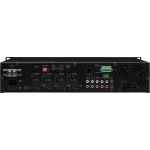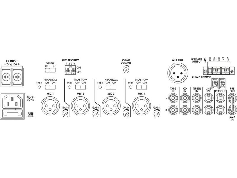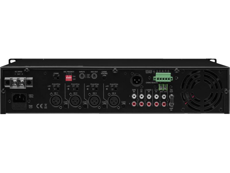Mono PA mixážny zosilňovač 1 x 240 W 4 vyvážené mikrofónové vstupy a linkové vstupy s voliteľnou prioritou 4 stereo linkové vstupy Výstupy reproduktorov cez skrutkové svorky Vyvážený linkový výstup Výstup pre nahrávanie Priestor pre vkladanie, napr. ef...