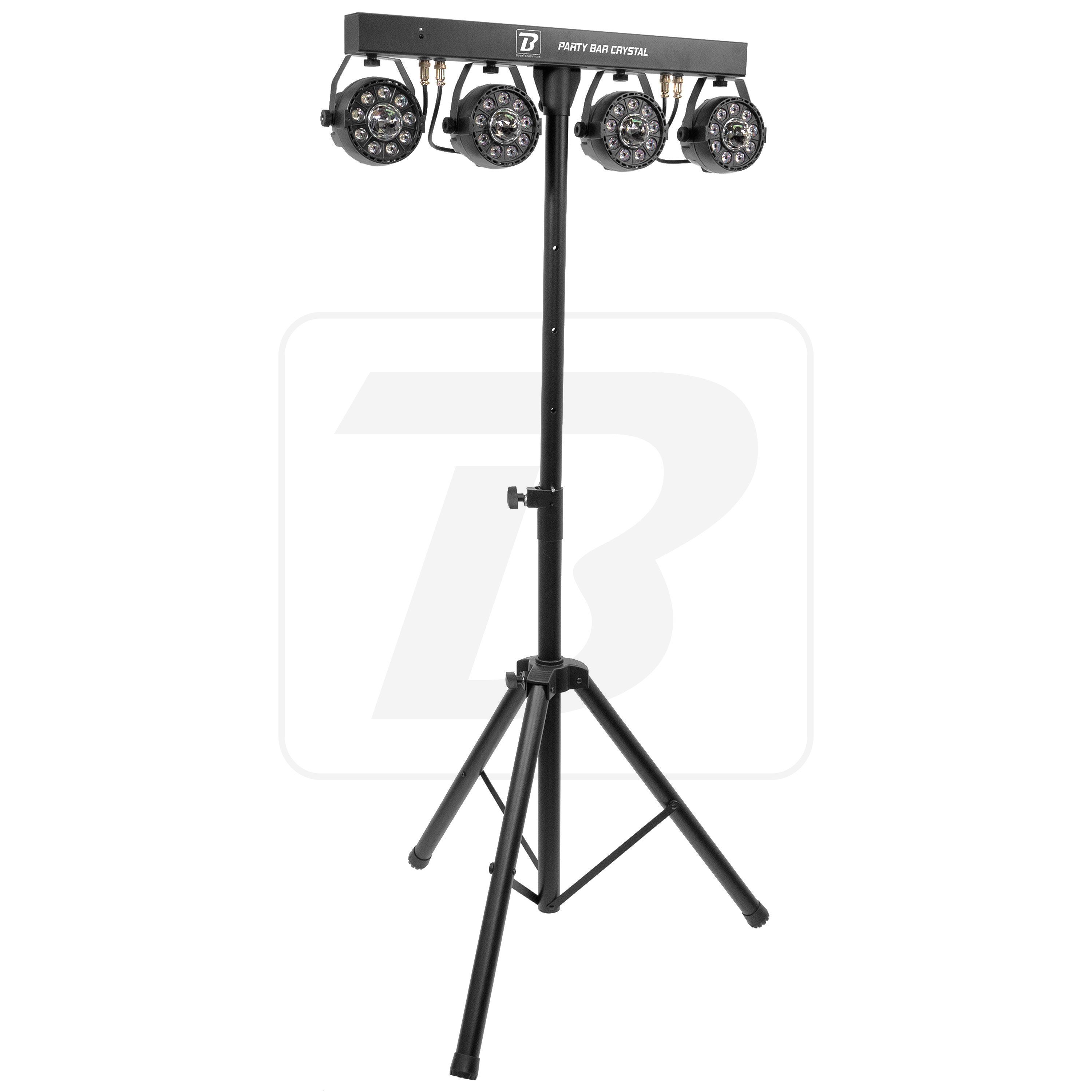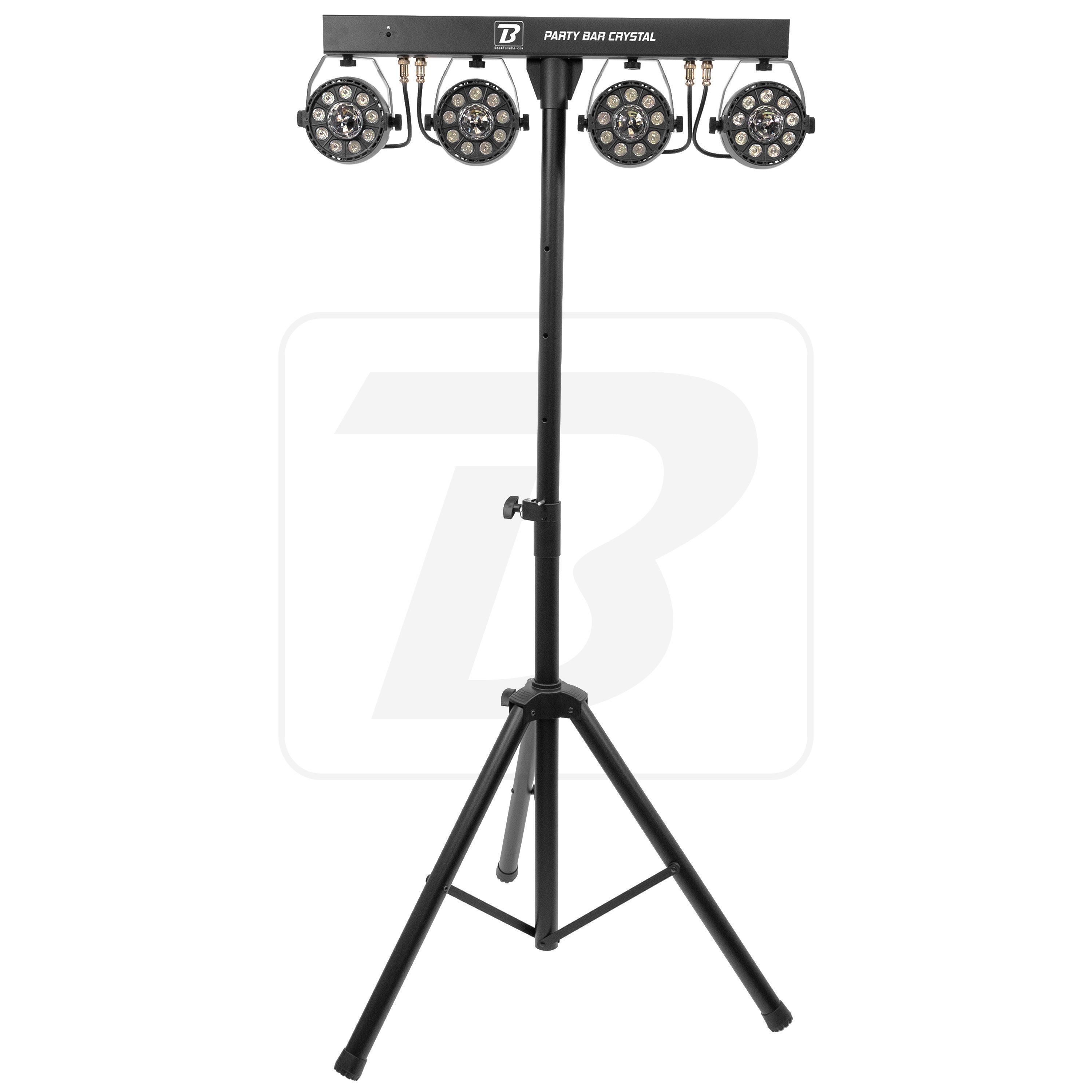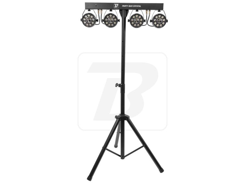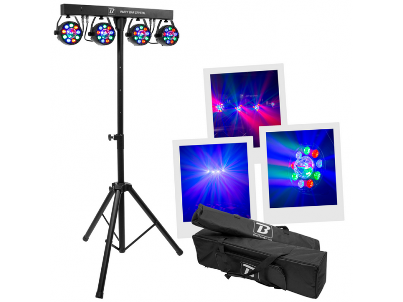 BoomTone DJ products, developed in France, are all subject to stringent, ongoing quality control to ensure you always get the best value for money on the market. With immediate availability and after-sales service in France, you can count on a reliable range of products at the best prices. The Party Bar Crystal MKII is a bar with 4 x 9 LED RGBW spotlights with a wide field of action and their multi-beam rotating effect in the centre, supplied with tripod and remote control. It has a host of automatic and musical programmes and can be controlled via DMX, for superb light shows. Practical and efficient, it's a benchmark! Ideal for mobile DJs, events, parties, discos, bars, clubs, weddings, birthdays, New Year's Eve, Halloween, concerts and theatre stages. - Set comprising 4 LED spotlights fixed to a horizontal bar and a tripod - Each spotlight features 9 x 1 W RGBW LEDs and a multi-beam effect rotating in its centre - Individual colour control by remote control supplied - Light beam angle: 25 - Operating modes: DMX, auto, remote control supplied - Ideal for bars, private parties, mobile DJs, etc. - Bar length: 60 cm - Max. height : 1,88 m - Dimensions: 388 x 919 x 200 mm - Weight: 5.2 kg