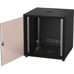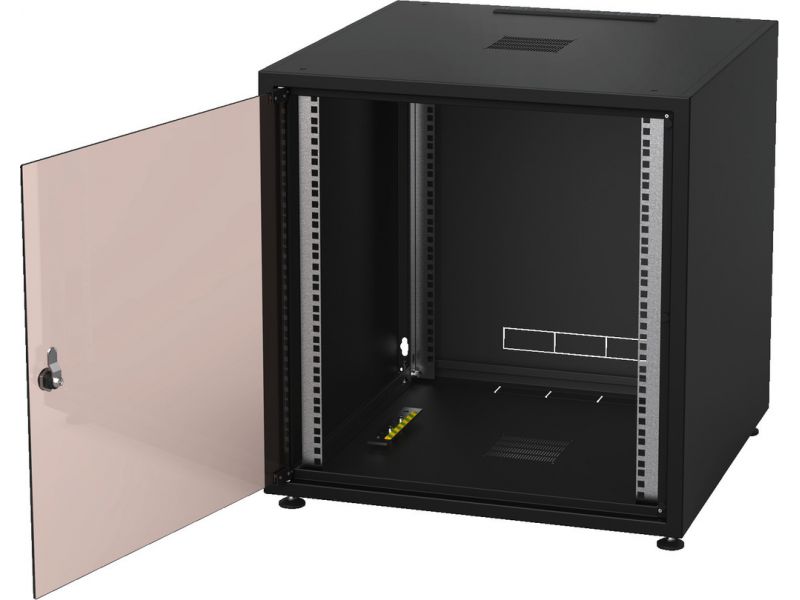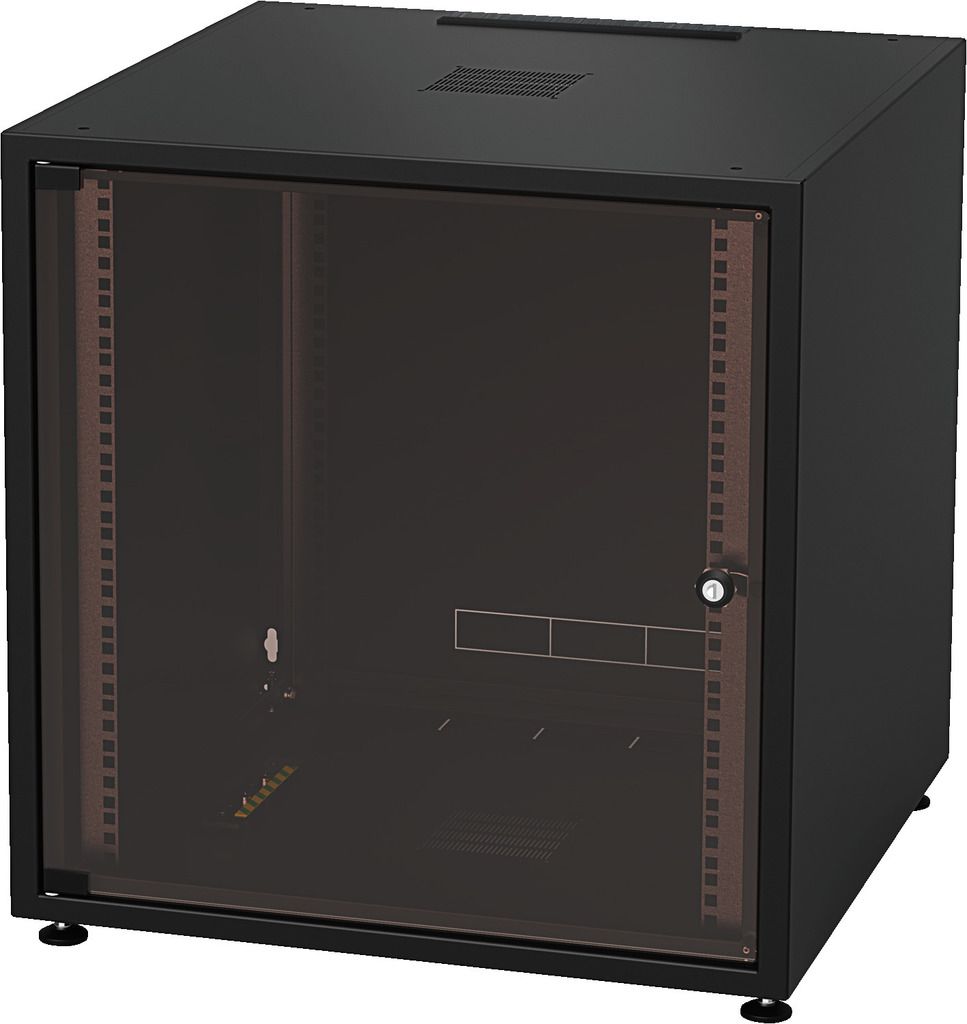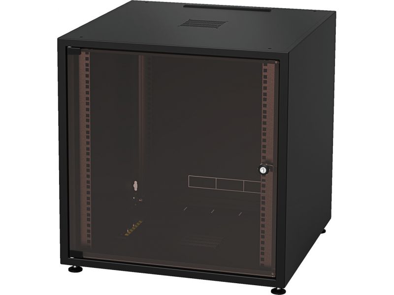 Professional studio racks for 482 mm (19") devices Front door with safety glass Sheet steel cabinet body and removable rear panel Black powder coating (RAL 9005) 4 levelling feet Earthing cable for rear panel Brush strip for cable inlet RACK-18GD/S...