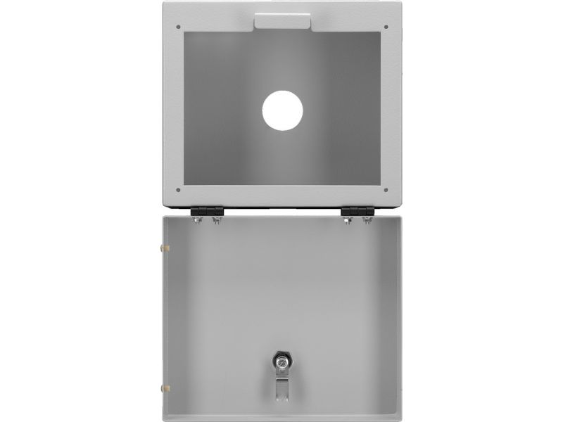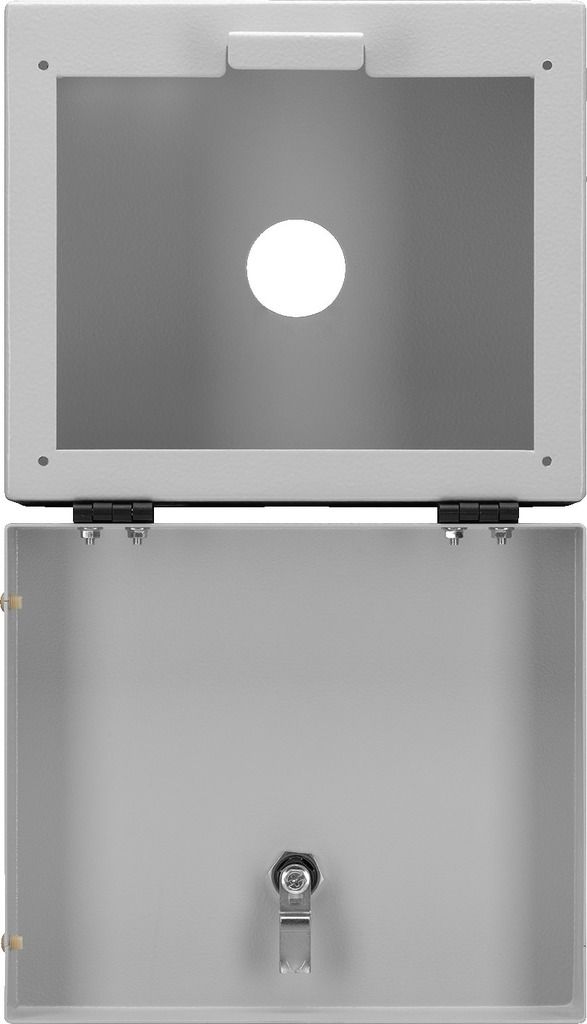 Wall-mounted housing, for mounting the mixer with integrated MP3 player MXT-52MP3. Sheet steel version Light grey powder coating (RAL 7035) Attached hinged cover, opens downwards, non-removable, lockable Round rear panel cutout (40 mm) for cable in...