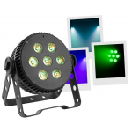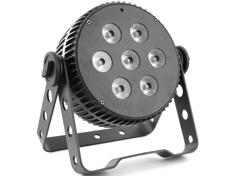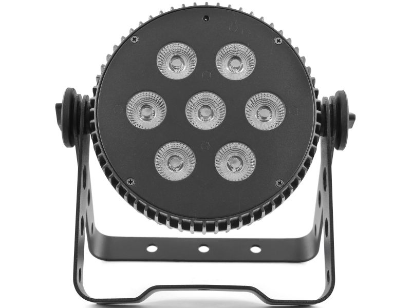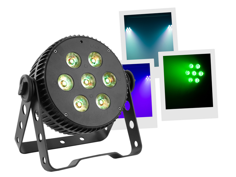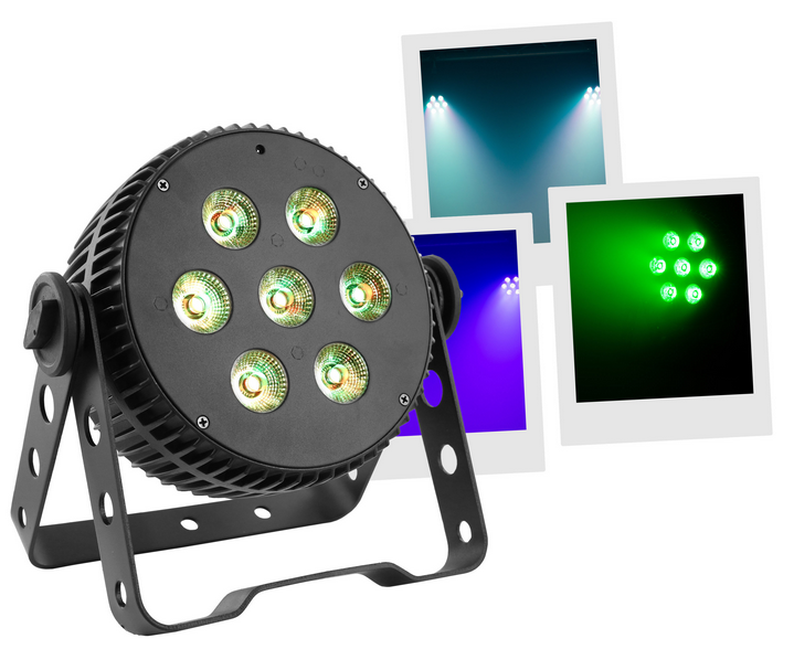 7 LED 10W RGBWA/UV 6-in-1 LED FloodlightLED PARAluminum housingControllable in DMX, auto, musical, IR remote control.Master/slave mode only on DMXVariable strobe functionDimmer 0#100%Quiet aluminum NFC case, no fan noisePerfect color mixing thanks to its...