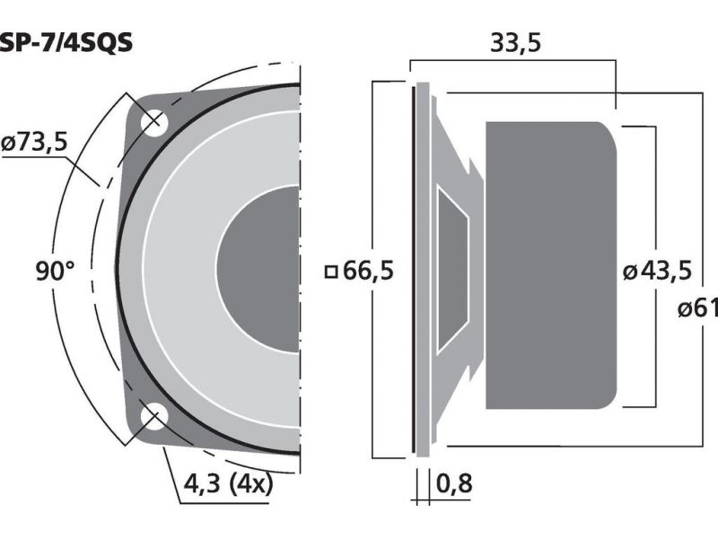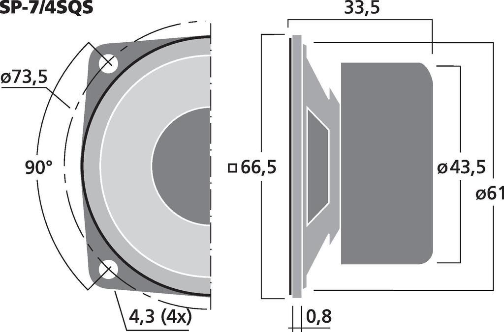 Univerzálny reproduktor, 8 WMAX, 4 WRMS, 4 Ω Magnetické tienenie Pre štandardné aplikácie Akustický tlak od cca. 200 Hz