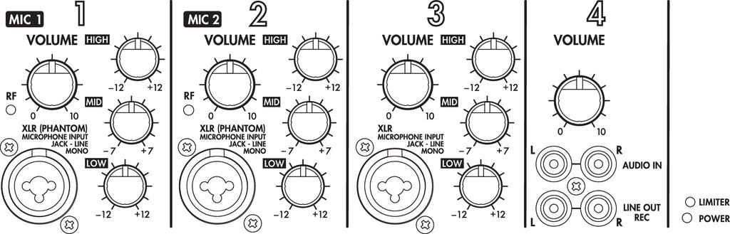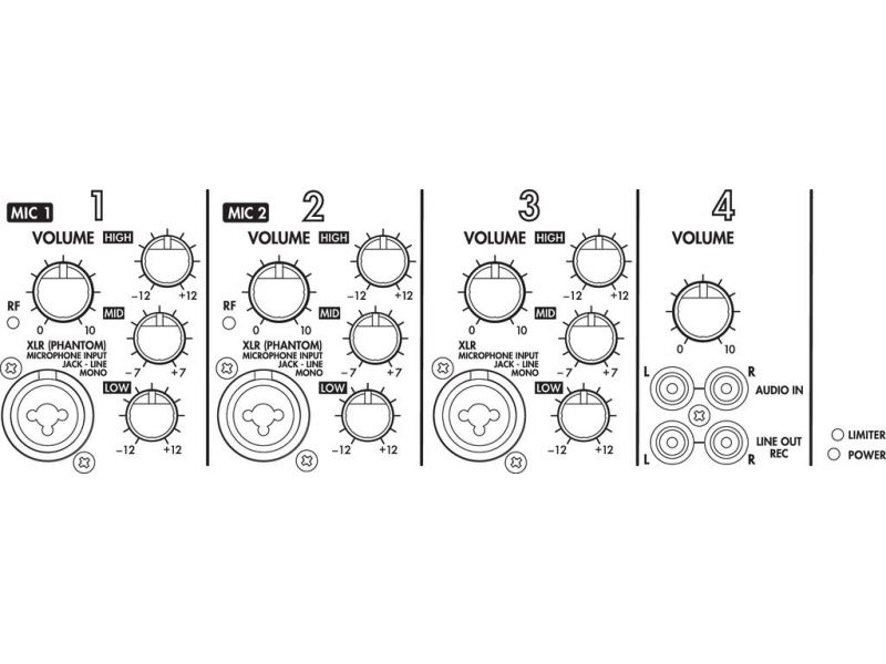 | Connections | 3 x XLR (mic), 3 x 6.3 mm jack (line), 1 x RCA L/R (line in), 1 x RCA L/R (line out) |