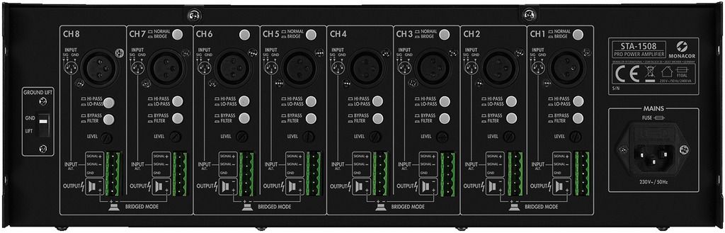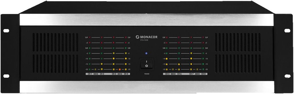 STA-1508 = 8 kanálov,"Presents itself as a power unit during monitor operation at stage performances in a club. The multi-channel concept of these amplifiers works out perfectly."