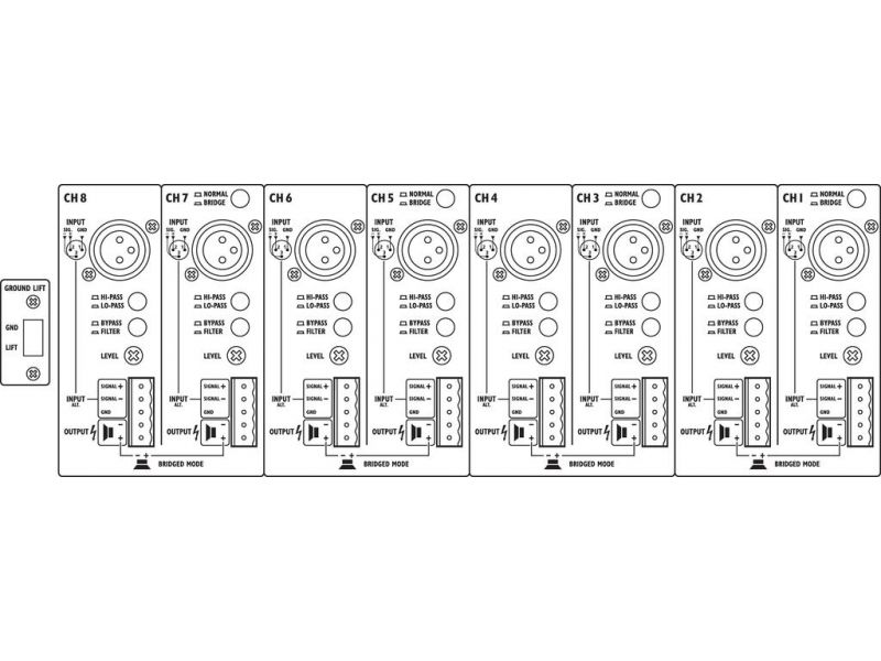 | Connections | 8 x 3-pole XLR, bal.8 x screw terminal |