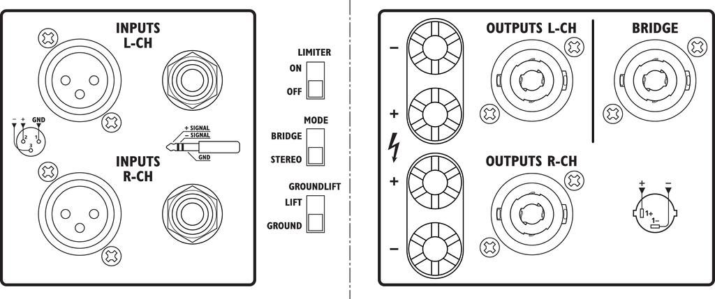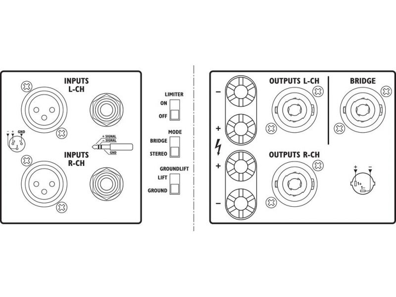 Stereo PA zosilňovač, s integrovaným limitérom. LCD displej pre zobrazenie teploty, operačného režimu a funkčnosti 2 operačné módy (stereo alebo v premostení) Možnosť zapnutia funkcie Limiter Teplotne ovládané ventilátory 2 ovládače úrovne Funkcia Ground...