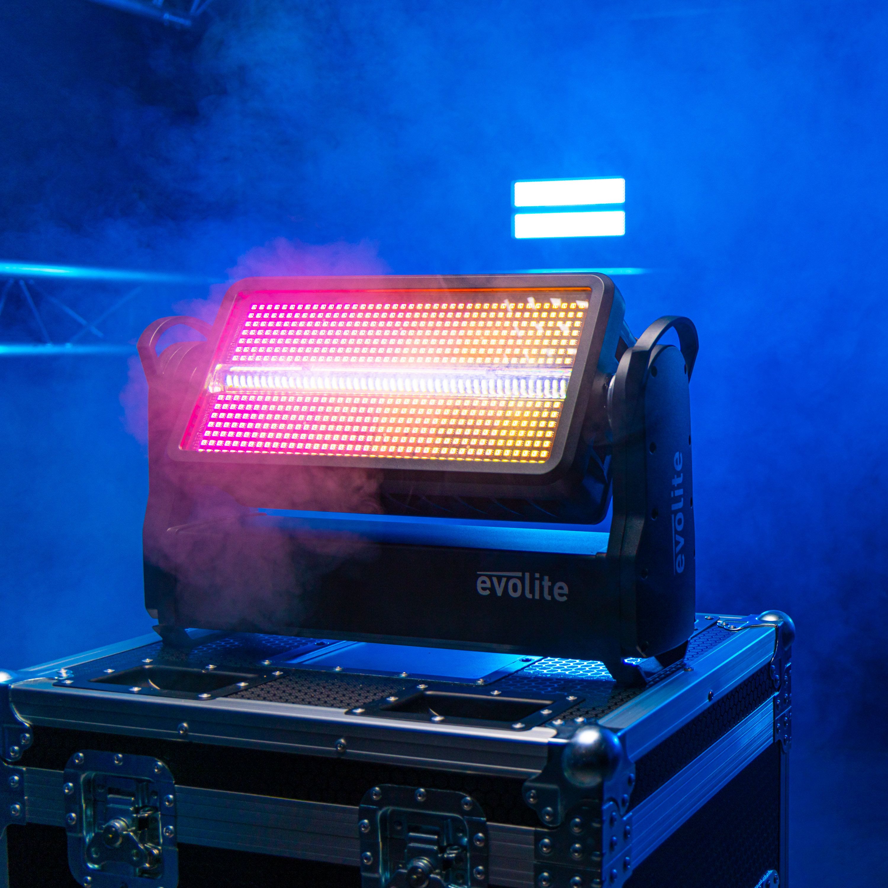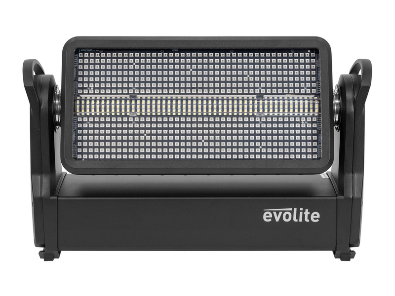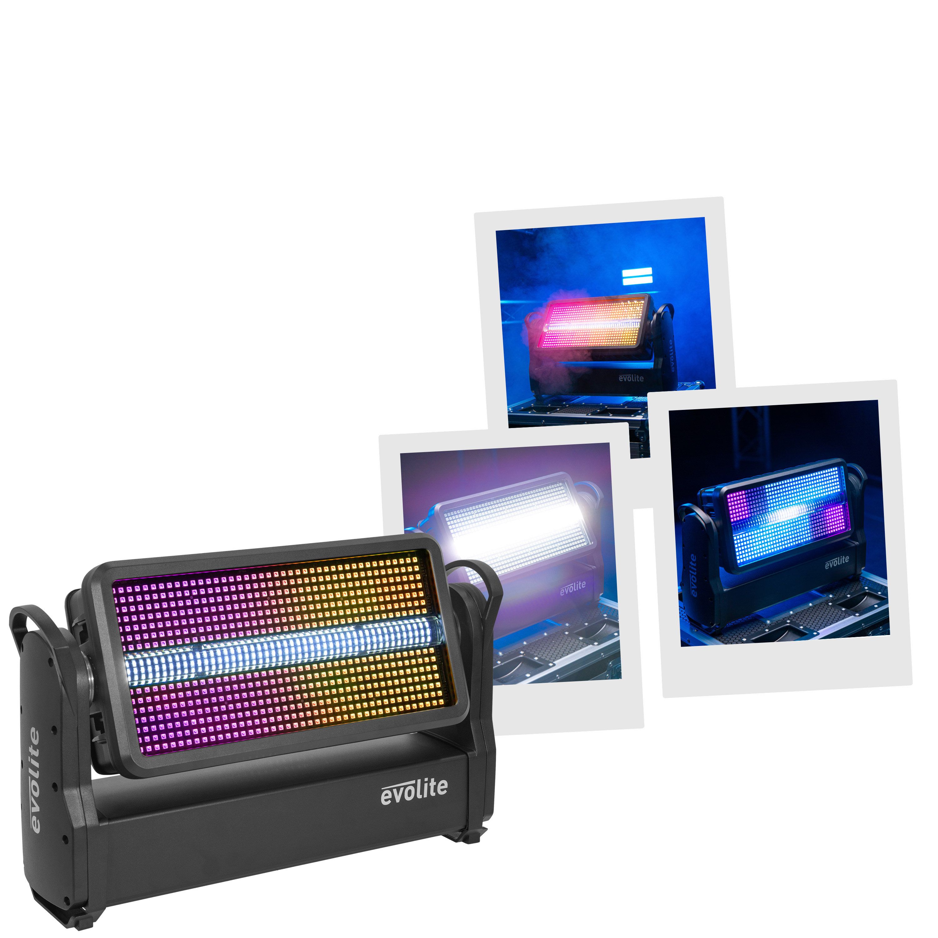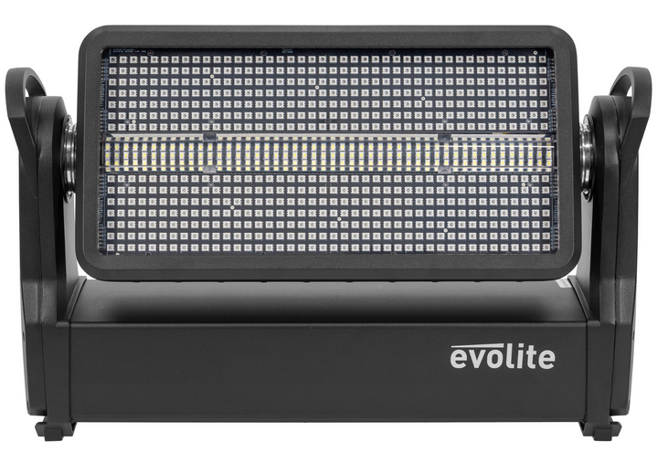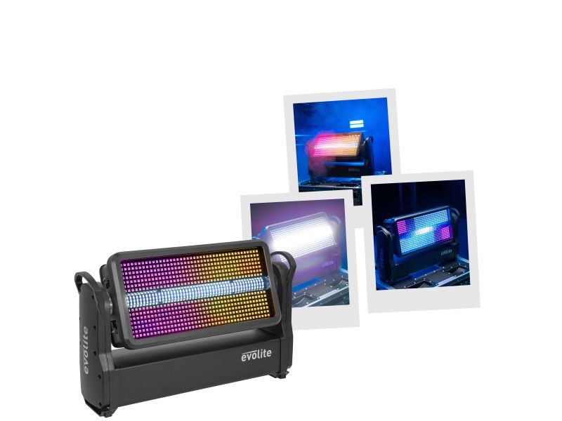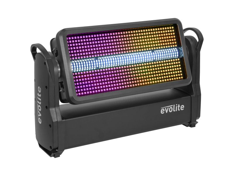Wash and Strobe hybrid outdoor spotlight, evolite Thunder Kolor. DMX, Artnet and automatic programme controls.evolite Pro Thunder KolorHybrid Wash and Strobe spotlightWash section with 588 SMD5050 0.5 W LEDs and 12 independent control zonesStrobe section...