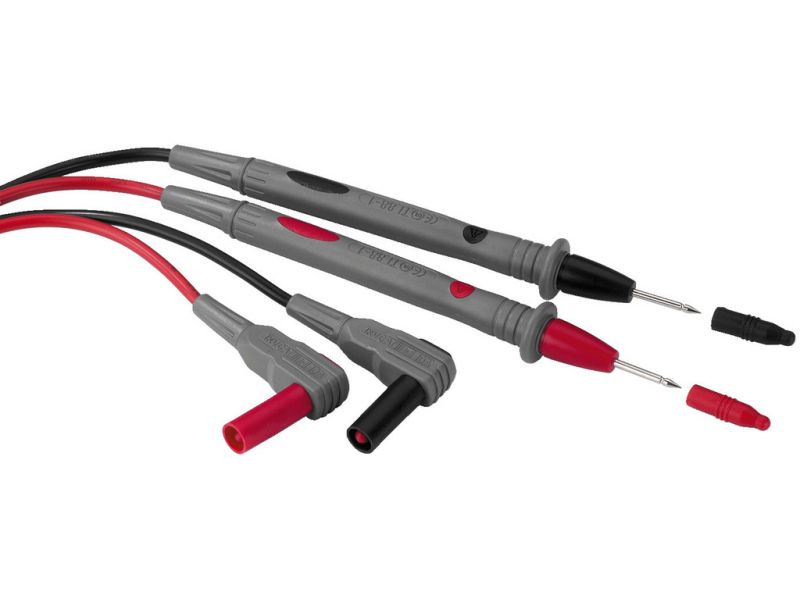 Dvojica testovacích káblov Vysoko flexibilný testovací kábel z PVC, červeno/čierny 4 mm pravouhlá bezpečnostná zástrčka 2 mm testovací hrot Testovací kábel Ø 3 mm, CAT III 1,000 V 10 A Dĺžka: 120 cm