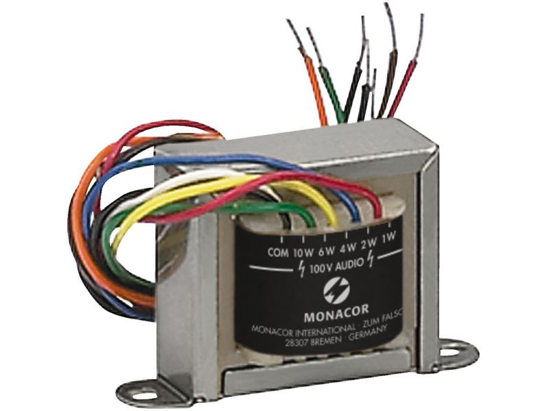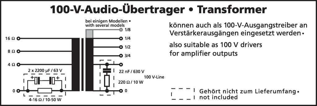 100 V vysoko výkonný audio transformátor Externý 100 V transformátor je potrebný pre zosilňovač alebo reproduktor bez nainštalovaného 100 V audio transformátora Je možné použiť každý z ponúkaných 100 V audio transformátorov