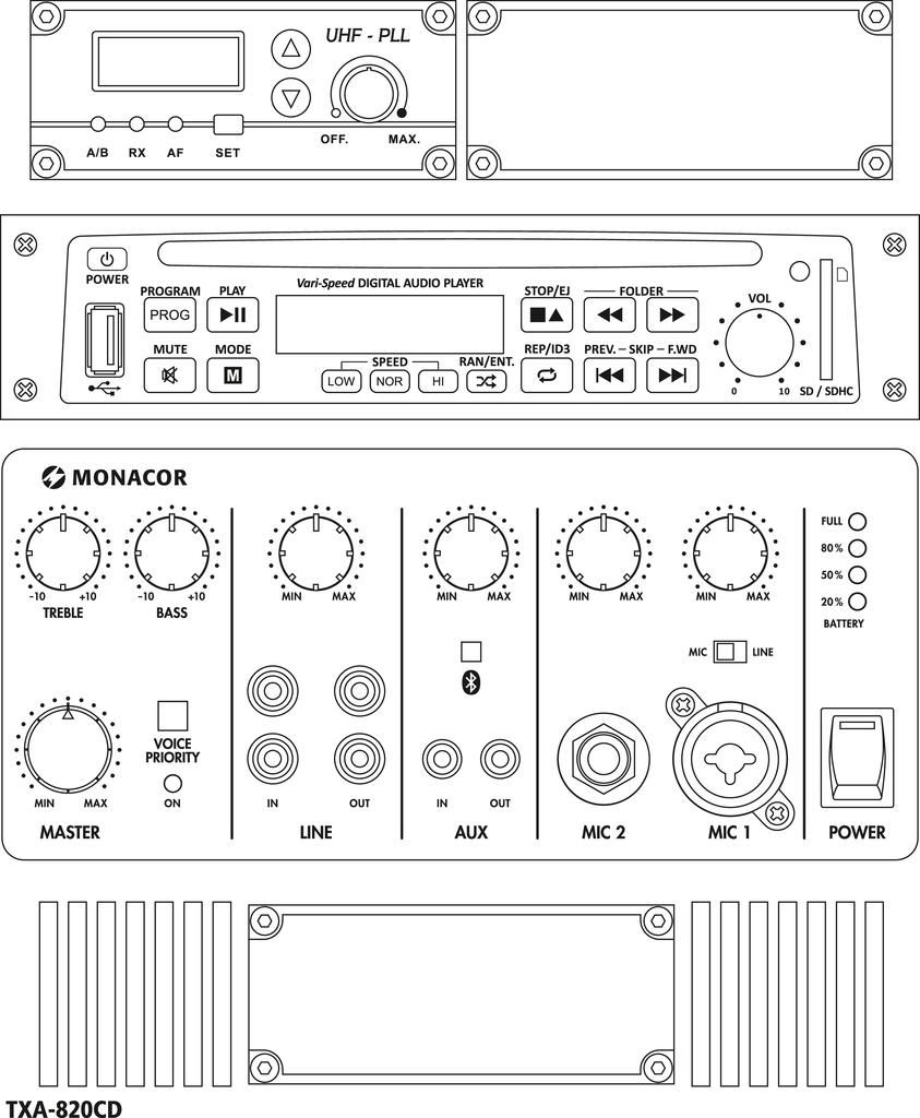 Prenosný zosilňovač, s integrovaným 1-kanálovým multifrekvenčným prijímačom s technológiou UHF PLL a Bluetooth prijímačom. Prevádzka pomocou sieťového pripojenia alebo zabudovanej dobíjateľnej olovenej gélovej batérie 2 x 12 V / 4,5 Ah (prevádzková doba...