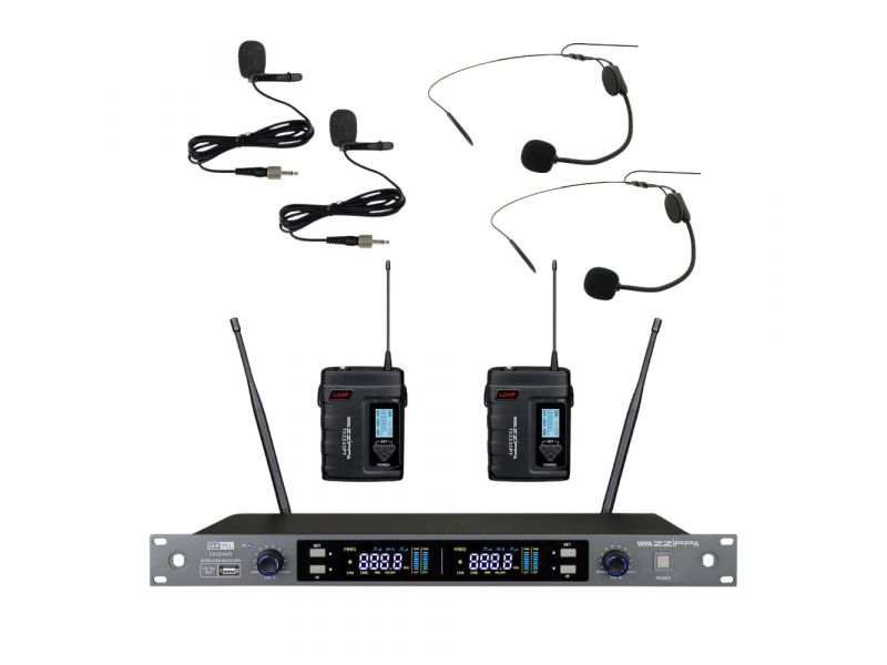TXZZ422 je dodávaný s prijímačom a dvoma bodypack vysielačmi, ktoré umožňujú pripojenie klopového (lavalier) mikrofónu alebo náhlavného headset mikrofónu.