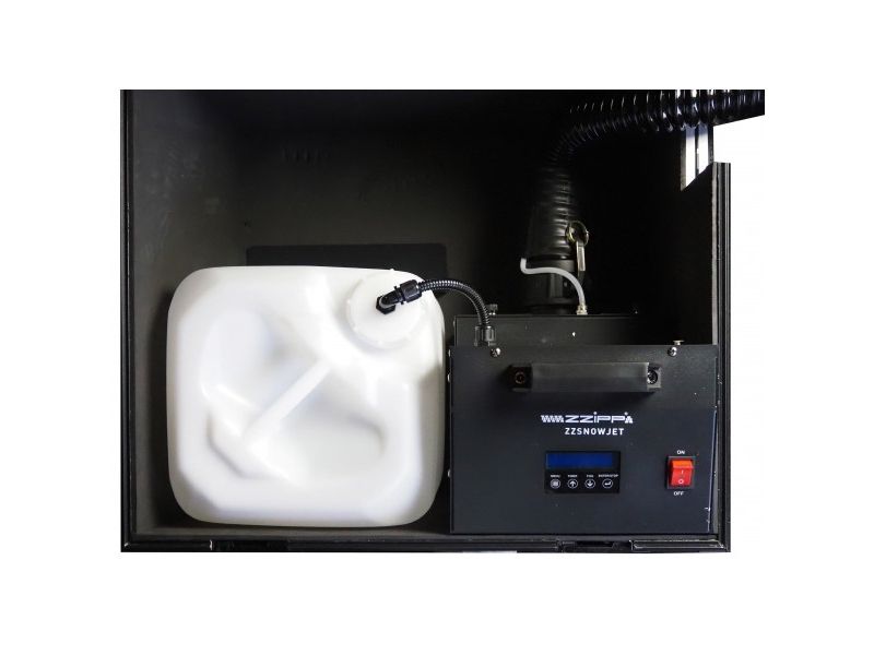 Výrobník snehu so smerovou tryskou a 10m káblom. Nádrž s objemom 20 litrov umožňuje nepretržité používanie s jedným doplnením kvapaliny.